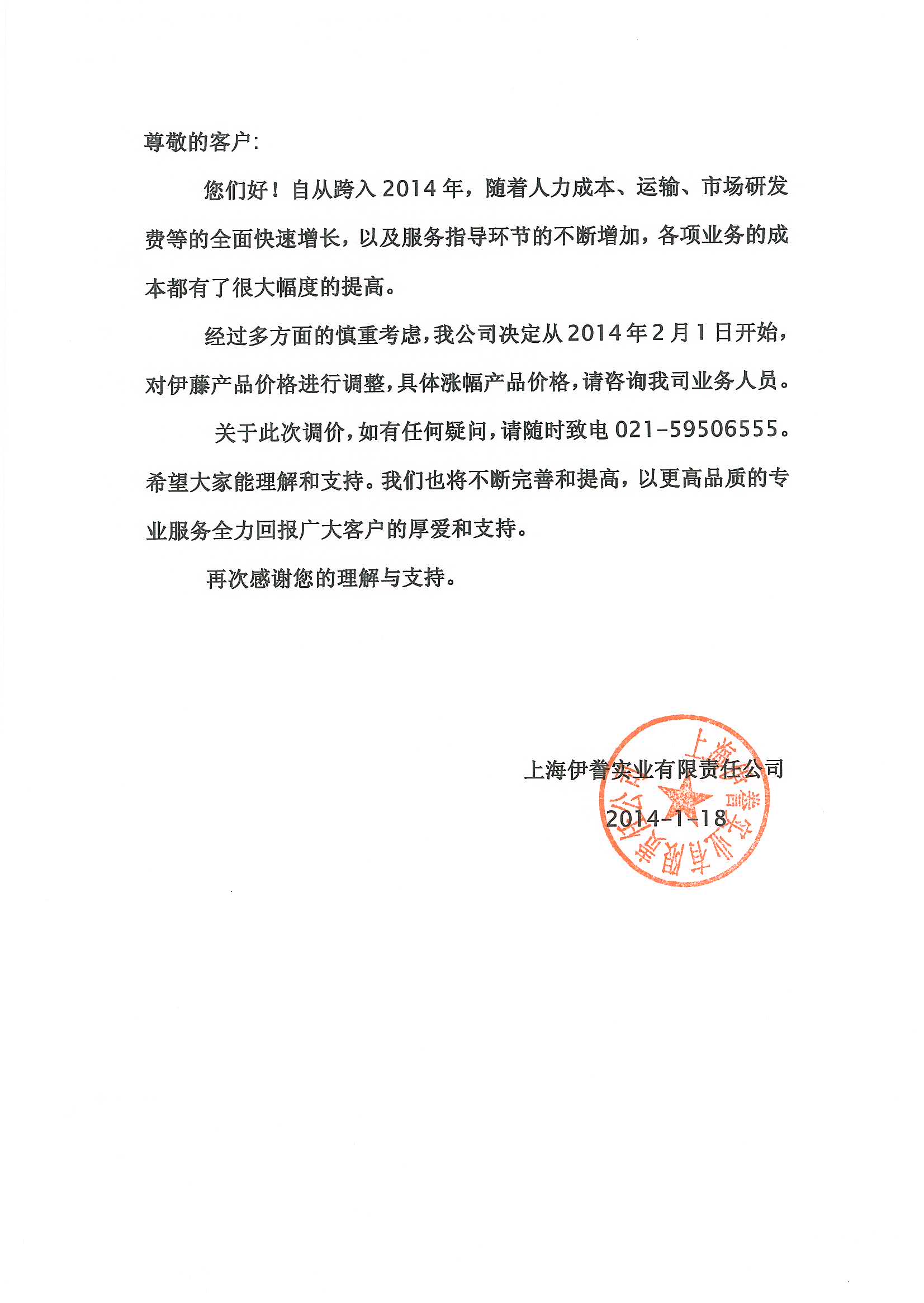 通知:廣大發電機用戶伊藤の動力品牌發電機自上次漲價后已有10年,這10年期間,我公司并未對發電機的價格做過調整,經過10年的一個錘煉,伊藤の動力品牌在新老用戶的支持下更上一個階梯,通過伊藤の動力品牌發電機管理層一致通過,所有伊藤の動力的機器由2014年2月1日開始漲價,具體漲價后的價格詳情請咨詢我公司銷售、客服人員:021-59507993 歡迎您的來電!也希望確定下來要購買的用戶,在1月份下單,保證您的利益!PS:狼來了!狼來了!喊了這么多次的狼來了,狼真的來了,對于伊藤の動力品牌這次發電機價格的調整有任何問題,請隨時來電咨詢:021-59507990 ! 最終解釋權歸上海伊謄實業有限責任公司所有!