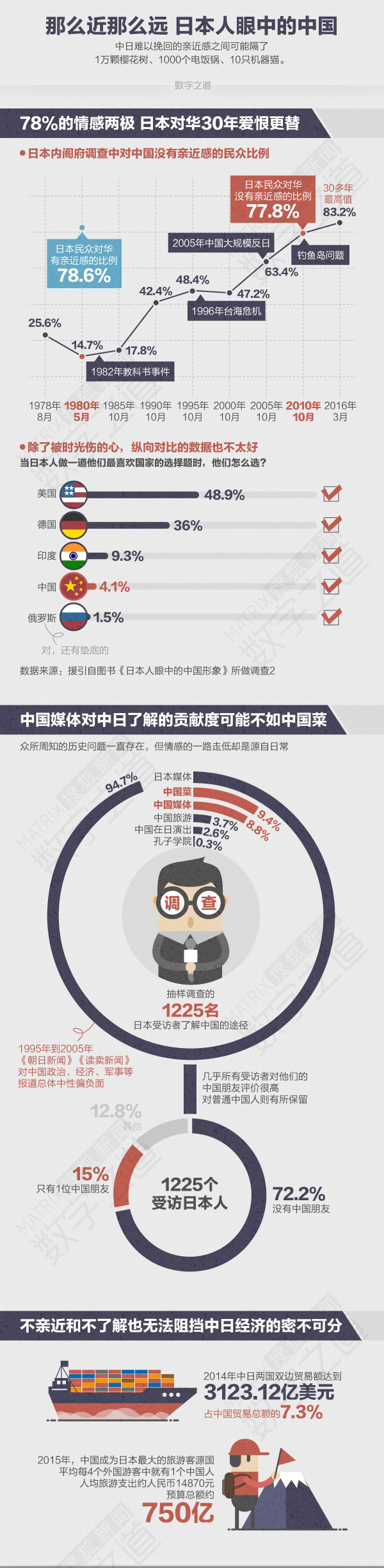 一篇文章中這樣介紹‘那么近那么遠(yuǎn),日本人眼中的中國(guó)’。從這篇文章和圖例上我們能夠發(fā)現(xiàn),中日關(guān)系在30年來的變化非常的奇妙。一方面,日本的某些媒體對(duì)中國(guó)一直是敵視的態(tài)度。另一方面,日本的主要經(jīng)濟(jì)又是依靠中國(guó)在成長(zhǎng)。